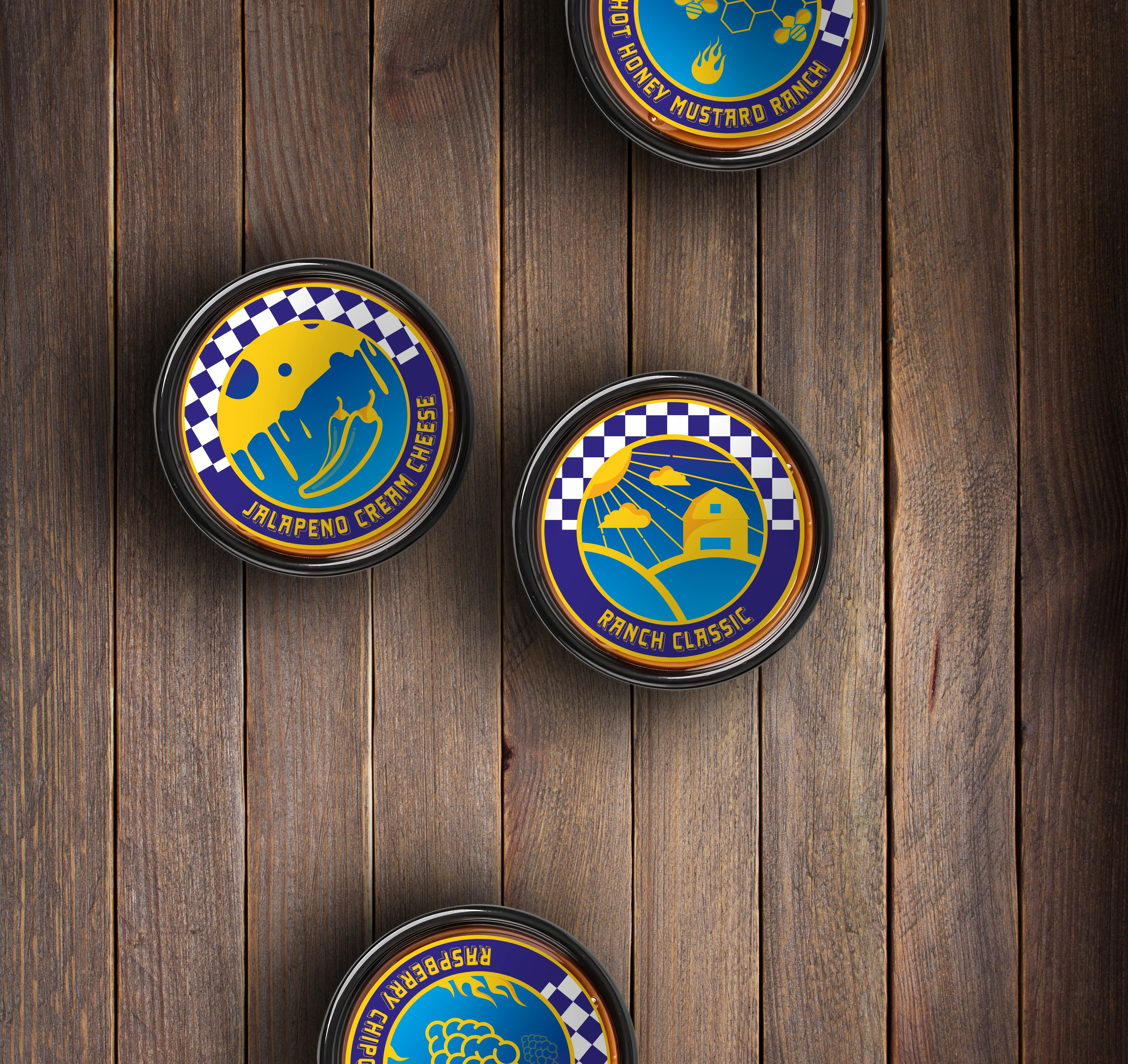 kräftige Farben, plakative Formen, illustrative Food-Icons und wiederkehrende Muster wie das Checkerboard.